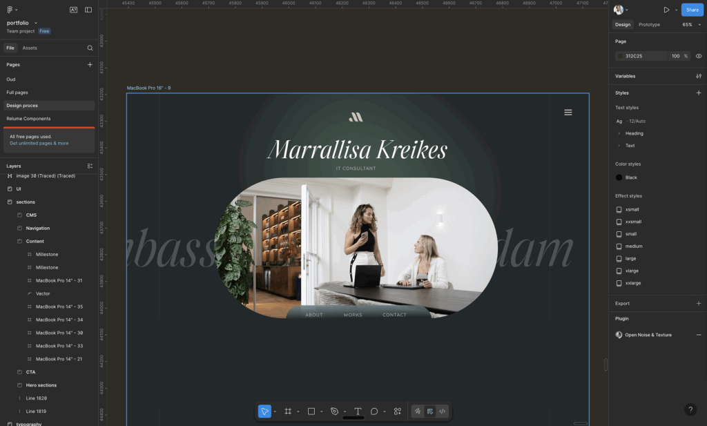 The journey starts in Figma. This is where your wireframe evolves into a one-to-one high-fidelity design of every page. At this stage, everything is visualized: fonts, brand colors, imagery, spacing, and layout hierarchy.