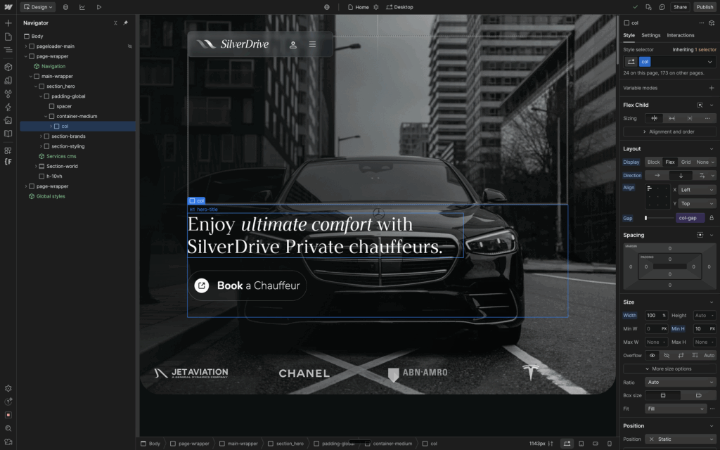 Once your design is locked in, it’s time to move into Webflow. Begin with a clean page structure: Home, Services, Projects, Blog, and Contact are common starting points.